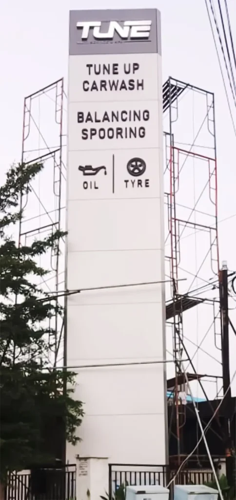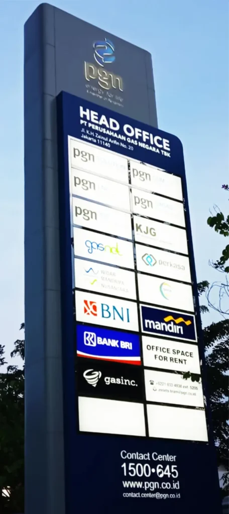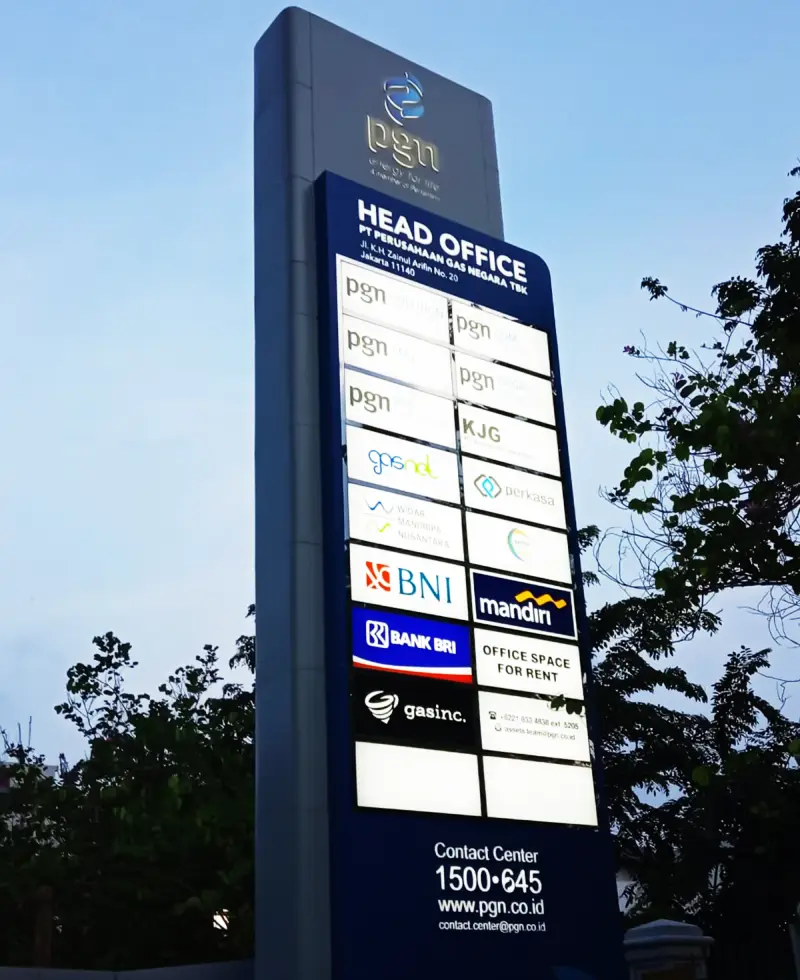 Pylon sign profesional untuk menghadirkan kesan prestisius di area komersial maupun gedung korporat.