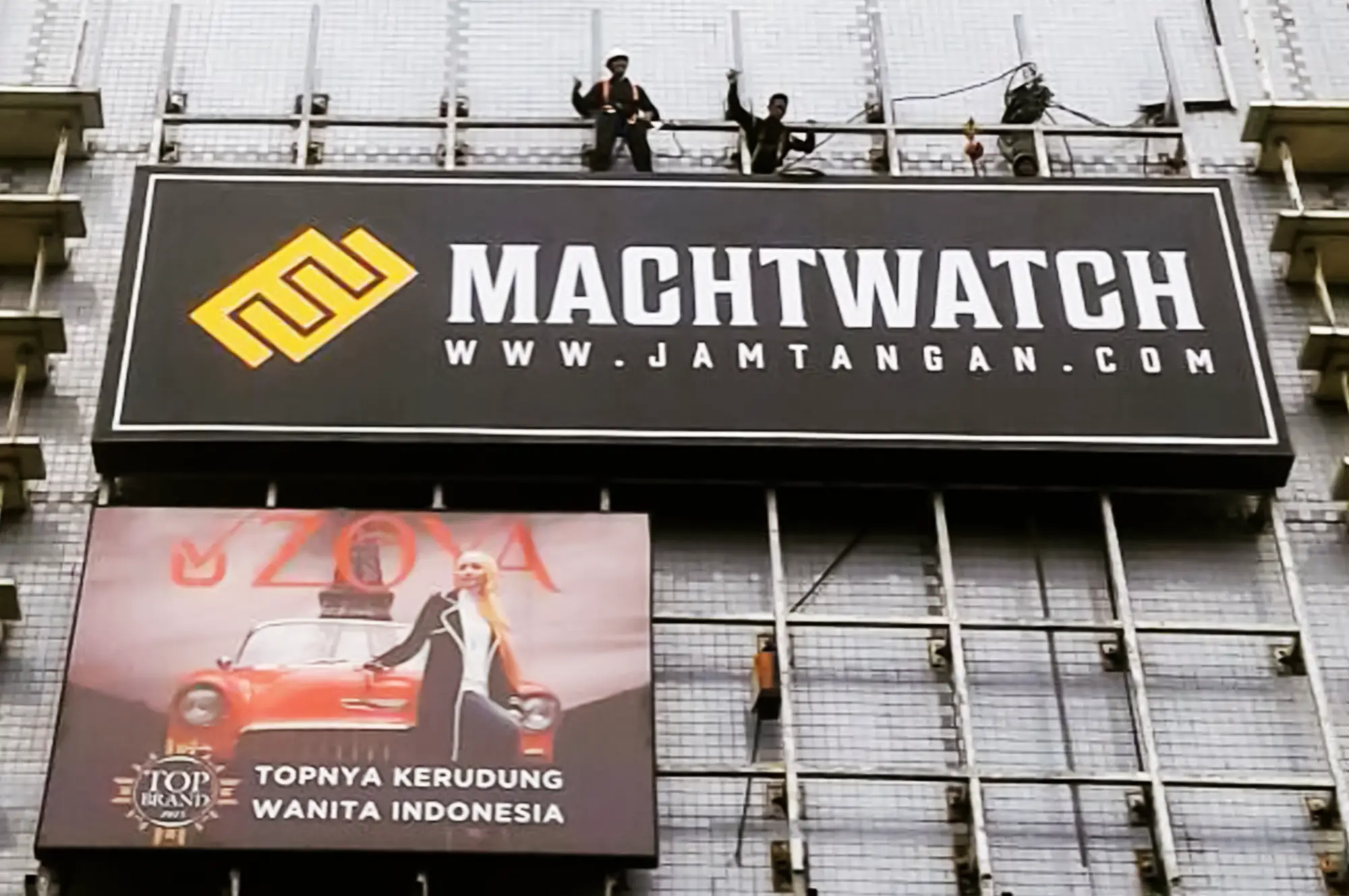 Proyek neon box Machtwatch berukuran 9×3 m ini menjadi bukti kemampuan kami menangani signage berskala besar dengan standar premium.